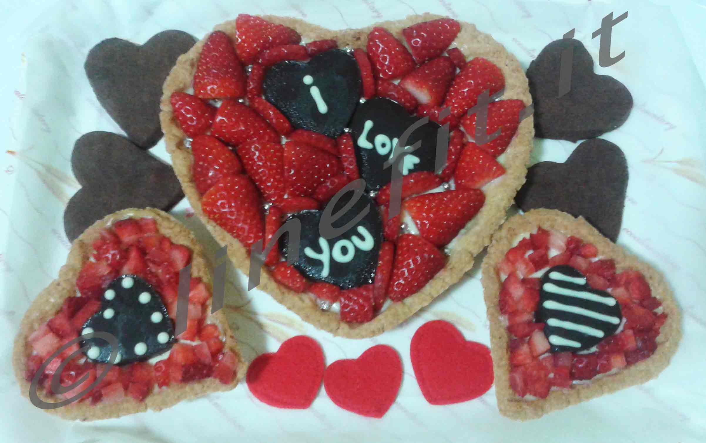 Trascorso questo tempo, togliere la pasta dal frigo e stenderla in una teglia a forma di cuore imburrata e infarinata, o rivestita di carta da forno, e bucherellarla con una forchetta. Procedere ora con la cottura in bianco della frolla: appoggiare sopra alla pasta un foglio di carta da forno, e riempirlo con dei legumi secchi, che faranno da peso per non fare alzare troppo la frolla. Infornare per 15 minuti a 180°C, poi togliere la carta forno con i legumi secchi e cuocere ancora per 10 minuti. Una volta cotta, togliere dal forno, lasciar intiepidire e sformare il guscio di frolla. Riempirlo con la crema pasticcera proteica e decorare con delle fragole tagliate a spicchi e dei cuori realizzati con del cioccolato fondente.