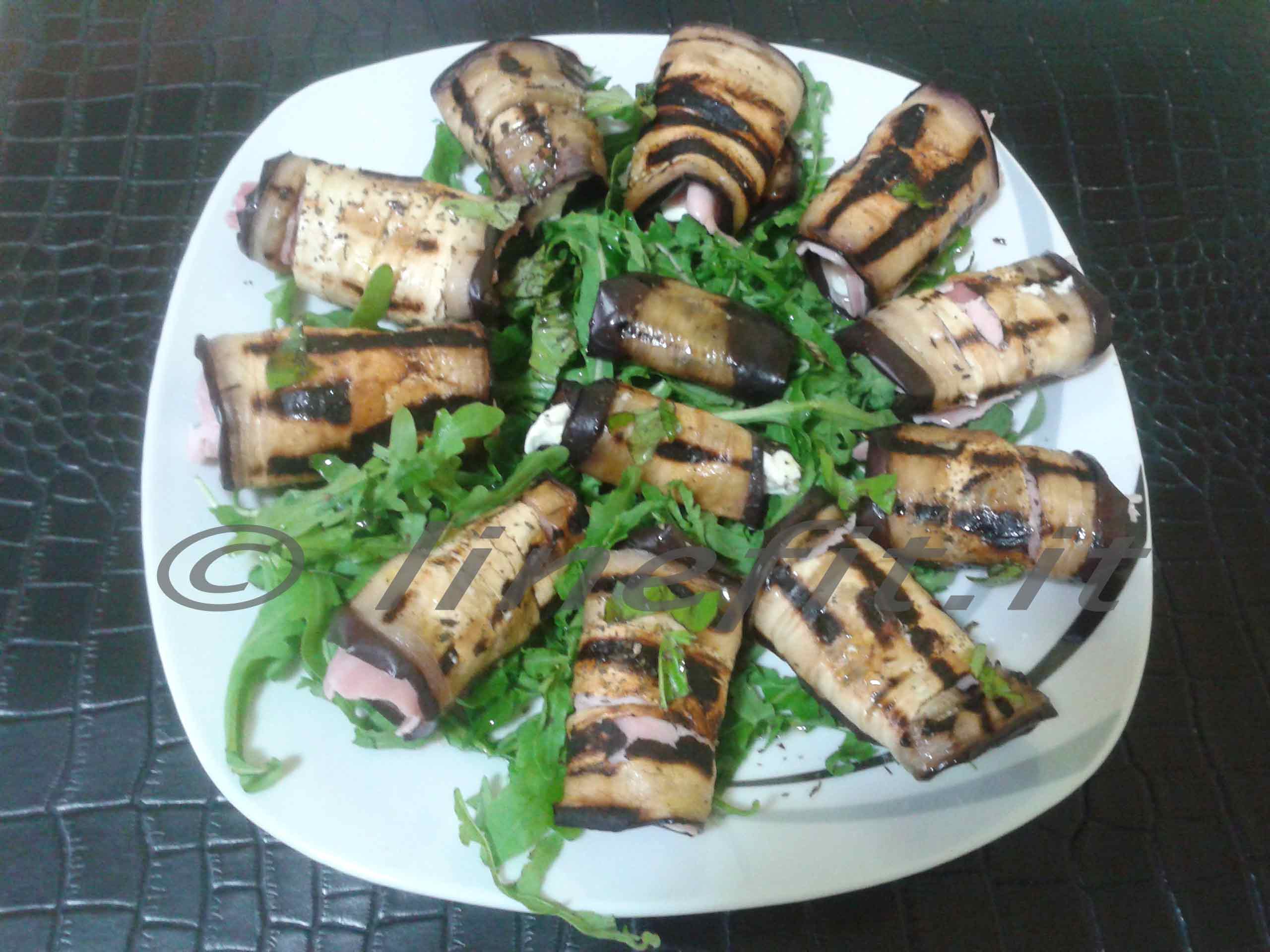 Lavare le melanzane e tagliarle a fette, nel senso della lunghezza, non troppo spesse. Far scaldare bene una piastra antiaderente e cospargere con un pizzico di sale. Quando è calda, grigliare le fettine di melanzane da entrambi i lati. Lascarle intiepidire e procedere a comporre gli involtini: spalmare su ogni fetta di melanzana un po’ di Philadelphia light e mettere al centro un po’ di prosciutto cotto; chiudere gli involtini girandoli su se stessi e sistemarli in un piatto da portata su un letto di rucola. Servire con un filo di olio extravergine.